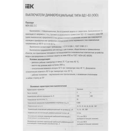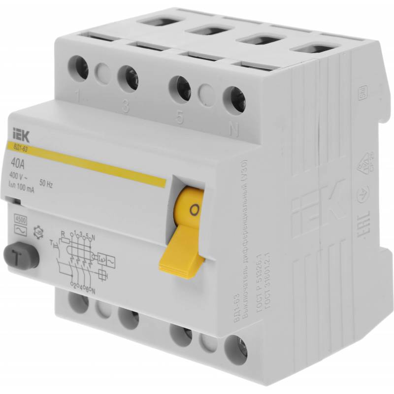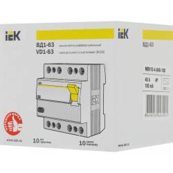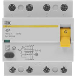 Выключатель дифф.тока УЗО IEK MDV10-4-040-100 ВД1-63 40A 100мА AC 4П 400В 4мод белый (упак.:1шт)
