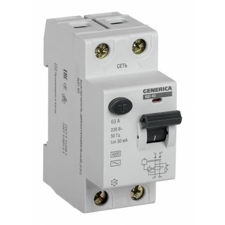 Выключатель дифф.тока УЗО IEK MDV15-2-063-030 ВД1-63 Generica 63A 4.5kA 30мА AC 2П 230В 2мод серый (упак.:1шт)