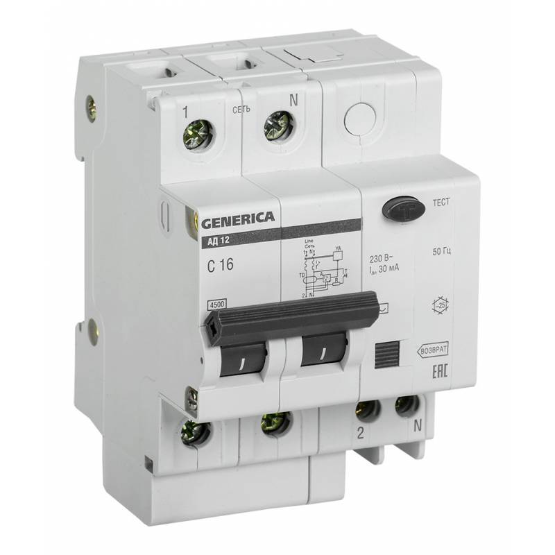 Выключатель автом. дифф. тока IEK MAD15-2-016-C-030 АД12 Generica 16A тип C 4.5kA 30мА AC 2П 230В 4мод серый (упак.:1шт)
