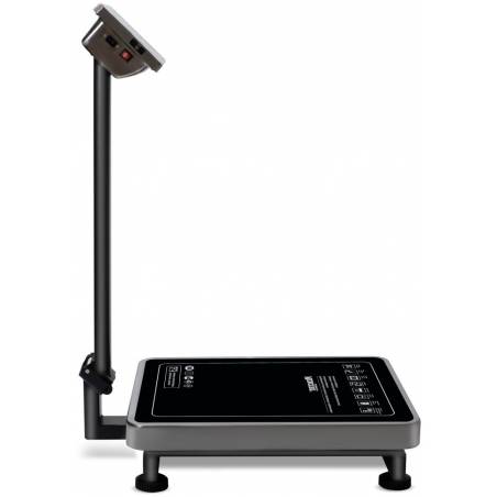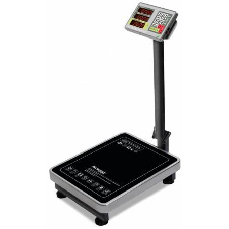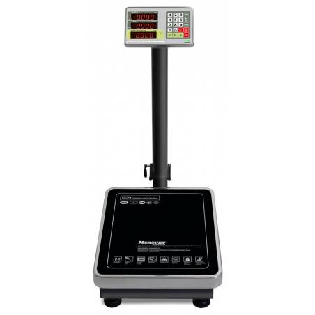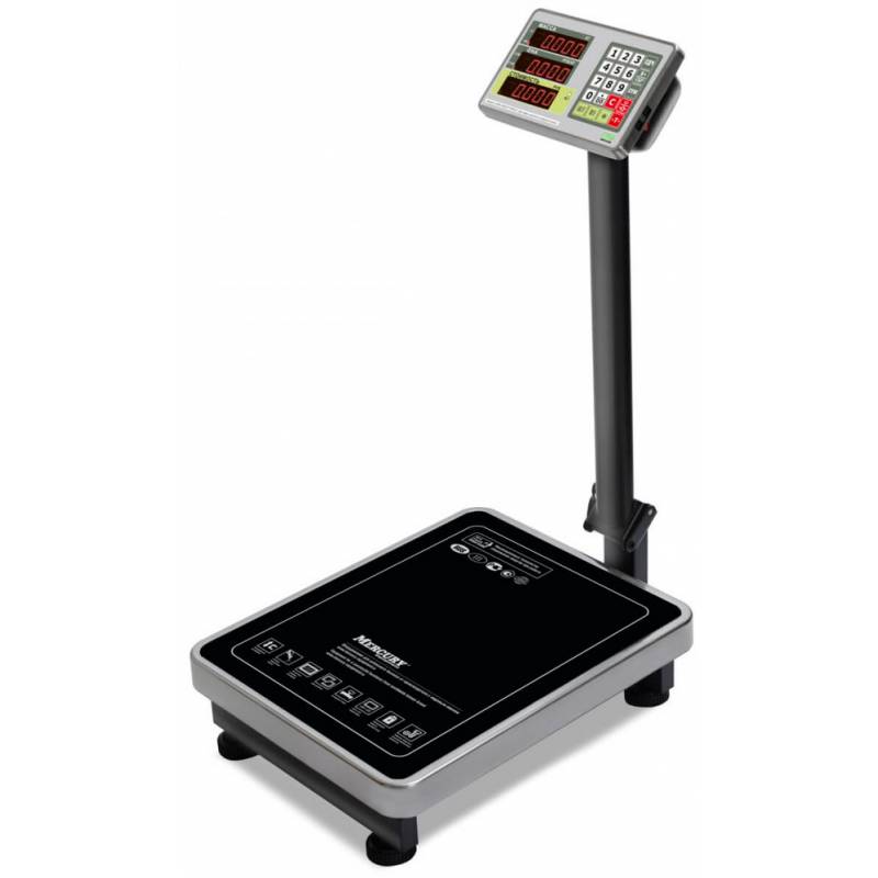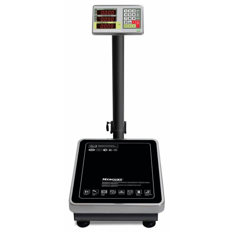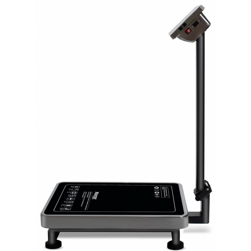 - Рама изготовлена из прочного металла и покрыта порошковой краской. Платформа изготовлена из нержавеющей стали. Итоговые цифры отображаются на LED-дисплеях. Предусмотрено 2 экрана: для покупателя и для продавца. Стойка легко складывается.