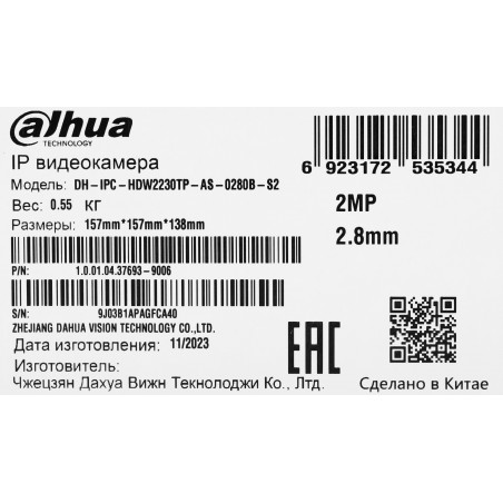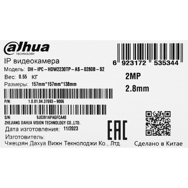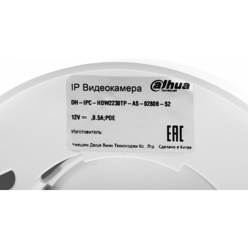 Камера видеонаблюдения IP Dahua DH-IPC-HDW2230T-AS-0280B-S2(QH3) 2.8-2.8мм цв. корп.:белый (DH-IPC-HDW2230TP-AS-0280B-S2)