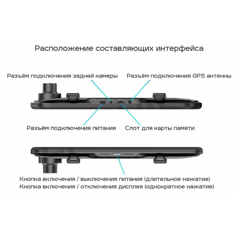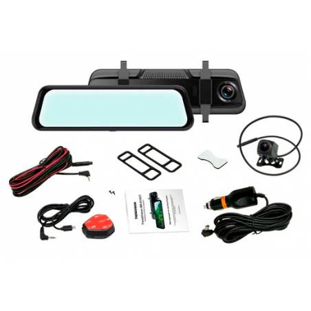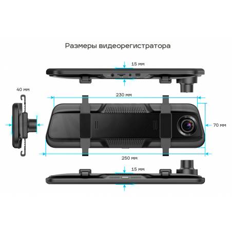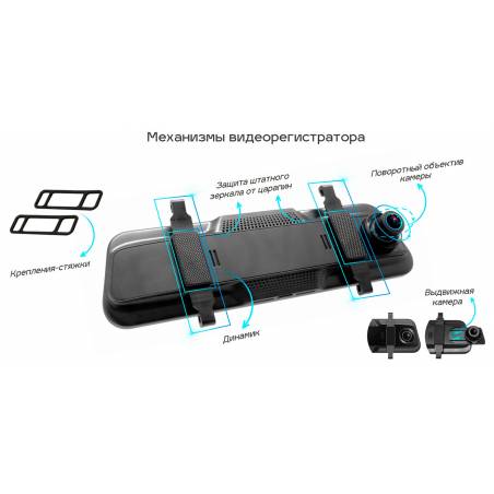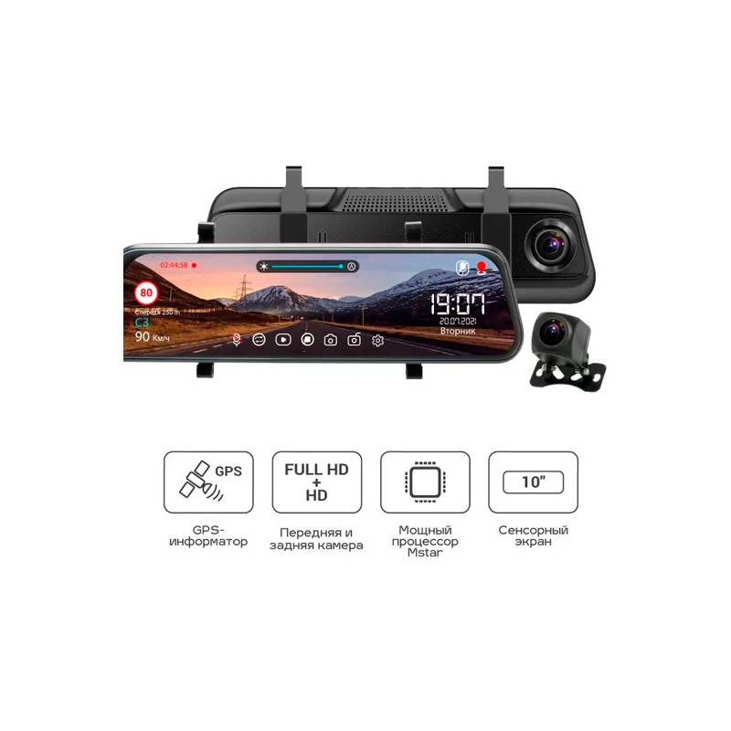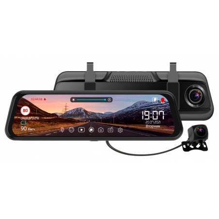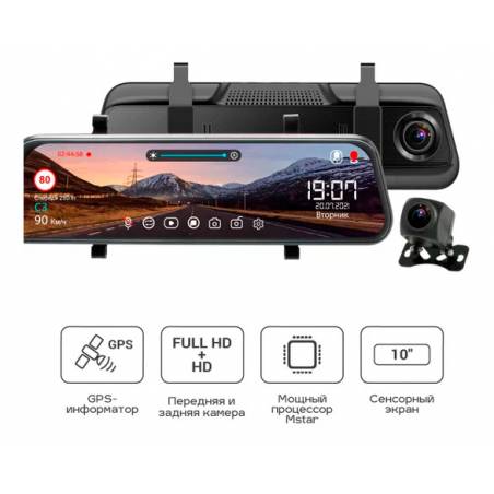 - Циклическая запись - 1, 3, 5 мин, запись с двух камер (1080p + 720p), функция SpeedCam (оповещение о камерах из базы GPS), режим "SplintScreen", парковочные линии при включении задней передачи, влагозащита задней камеры - IP67