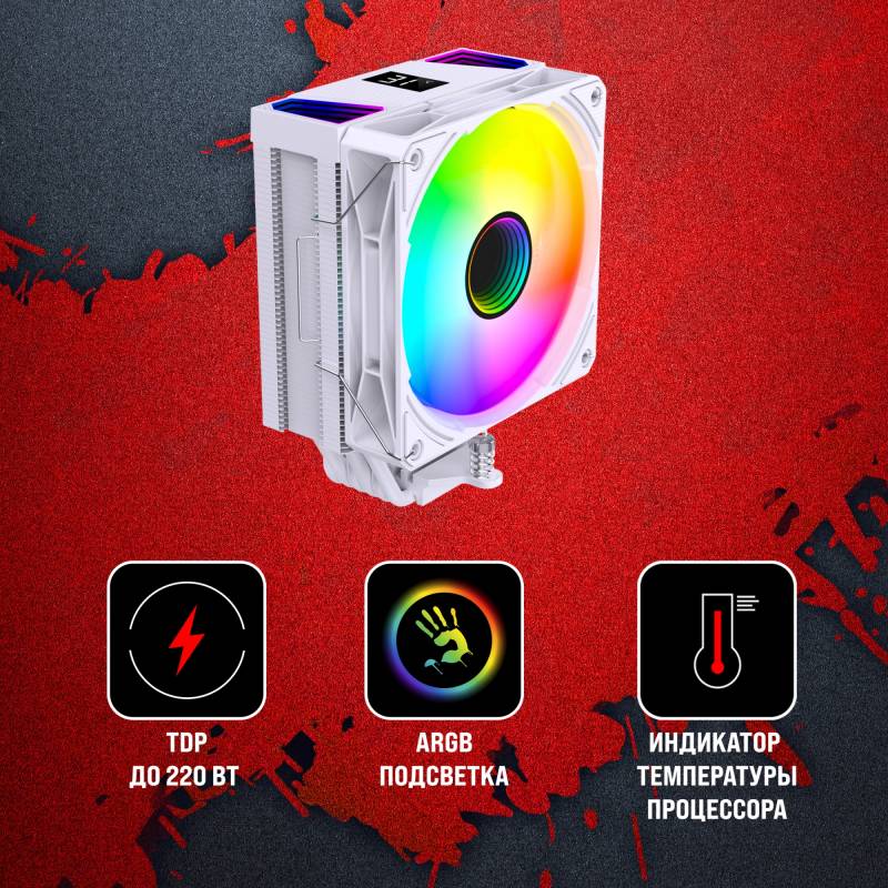 Устройство охлаждения(кулер) Bloody BD-AC220-ARGB1 ARGB Soc-AM5/AM4/1200/1700/1851 белый 4-pin 14-26dB Al+Cu LCD 220W 596gr Ret