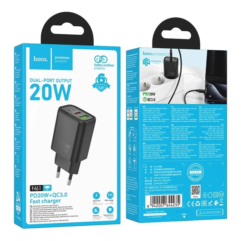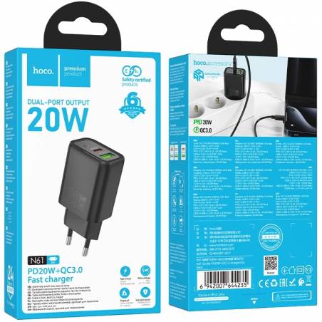 Сетевое зар./устр. Hoco N61 Gentle 20W 3A (PD+QC) USB/USB Type-C универсальное черный (44235)