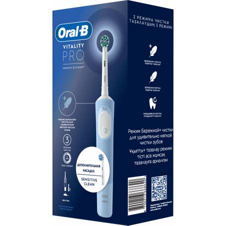 - Электрическая зубная щетка нового поколения Oral-B Vitality PRO обеспечит ощущение профессиональной чистки каждый день и подойдет даже для любителей экстра бережного очищения благодаря уникальному режиму SENSITIVE PLUS.
